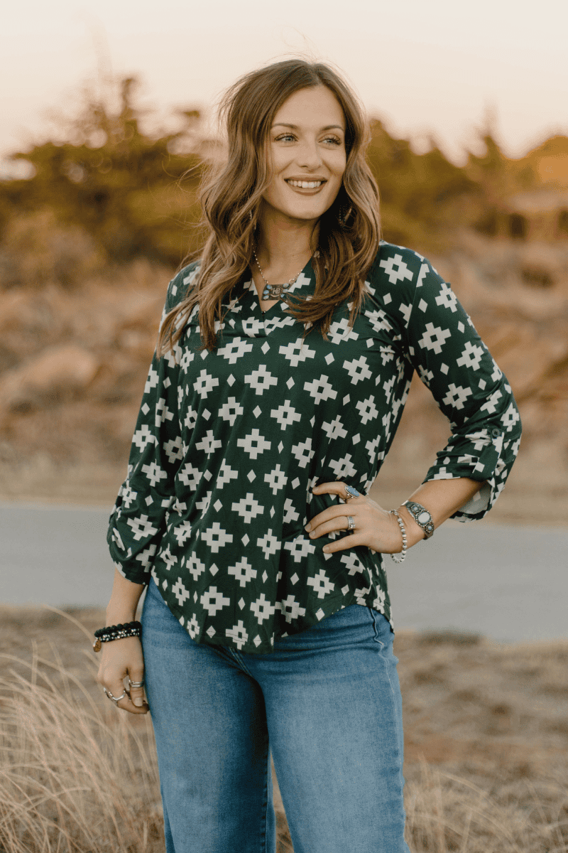 The Aztec Pines Top features a captivating dark green background adorned with a delicate cream Aztec design, offering a unique blend of boldness and elegance. Perfect for making a stylish statement, this top adds cultural charm and vibrant contrast to your wardrobe. Its striking pattern ensures you stand out effortlessly, combining comfort with eye-catching detail.