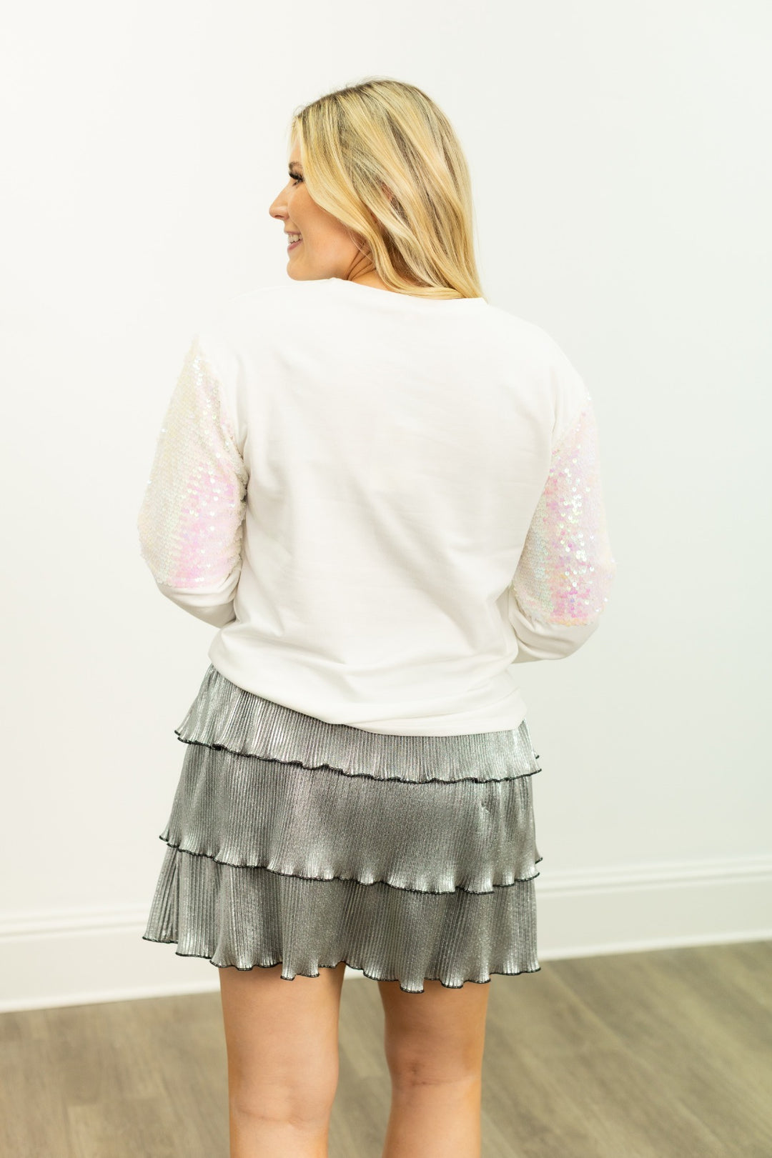 This lightweight French terry sweatshirt blends everyday comfort with a festive twist. Designed with high-stretch fabric for easy movement, it features sequin-accented sleeves lined on the inside to ensure a smooth, itch-free feel against the skin. The classic crew neckline and standard t-shirt length make it easy to wear solo or layered. Soft, breathable, and thoughtfully detailed, it's the perfect piece to add a little sparkle to your day without sacrificing comfort.