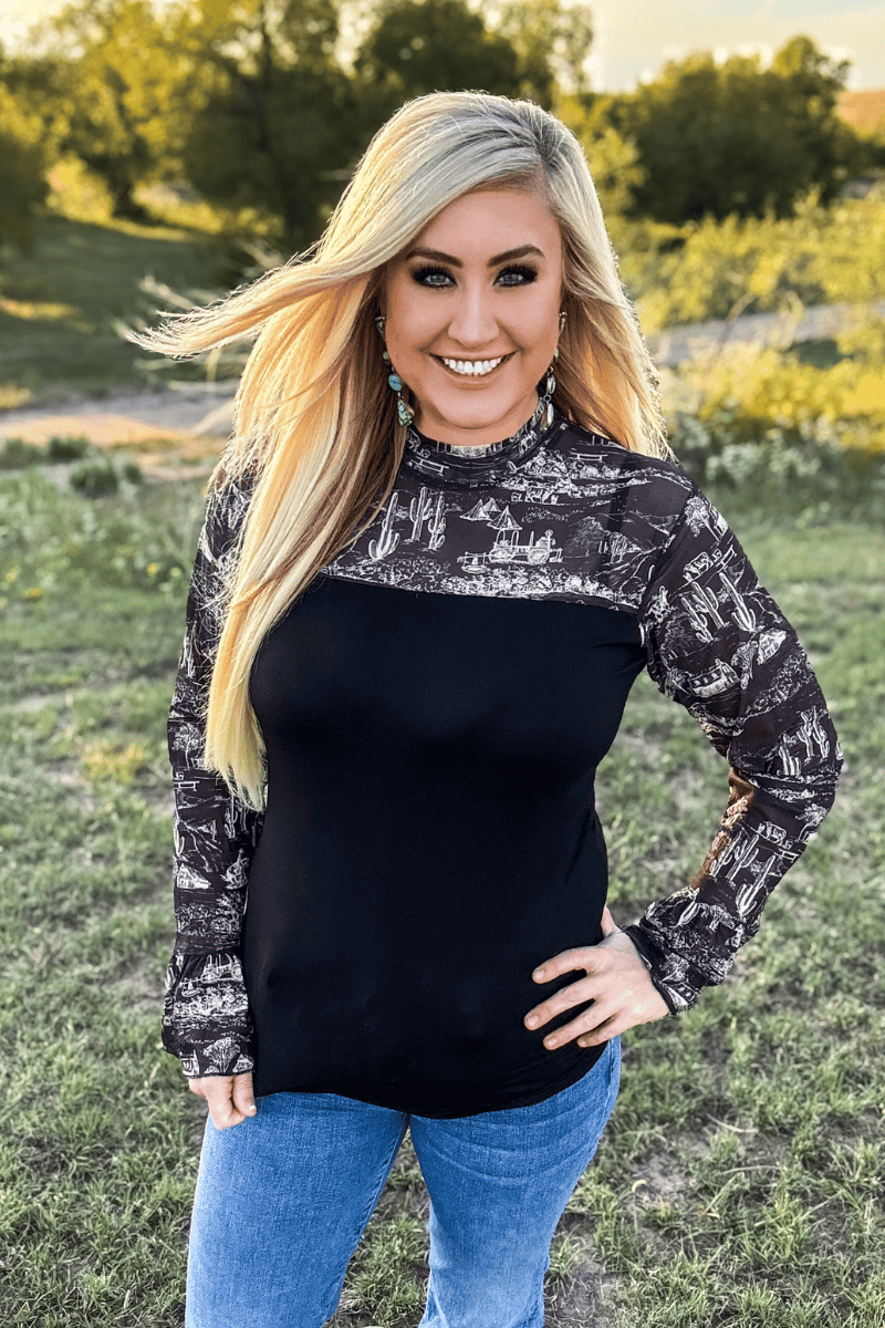Elevate your wardrobe with the Homestead Toile Top, featuring sleek black fabric complemented by mesh sleeves adorned with a delicate cream toile pattern. This unique combination delivers a sophisticated, modern look while offering breathable comfort. Perfect for dressing up or down, it adds a refined touch to any outfit.