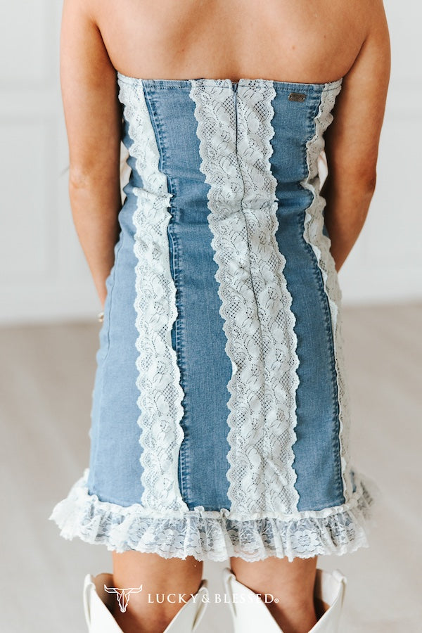 Turn heads with this feminine-meets-Western denim mini dress from Lucky & Blessed—the perfect blend of cowgirl charm and contemporary fashion. This strapless bodycon silhouette hugs the figure, while the delicate white lace panels add a romantic and flirty touch from top to hem. Designed with vertical lace trim that elongates the frame and a ruffled lace hemline that adds movement and flair, this dress is a must-have for your boutique’s Fall collection. Whether layered with a denim jacket or styled solo with boots and silver jewelry, this dress is ideal for rodeo nights, Western festivals, and all things Southern chic.